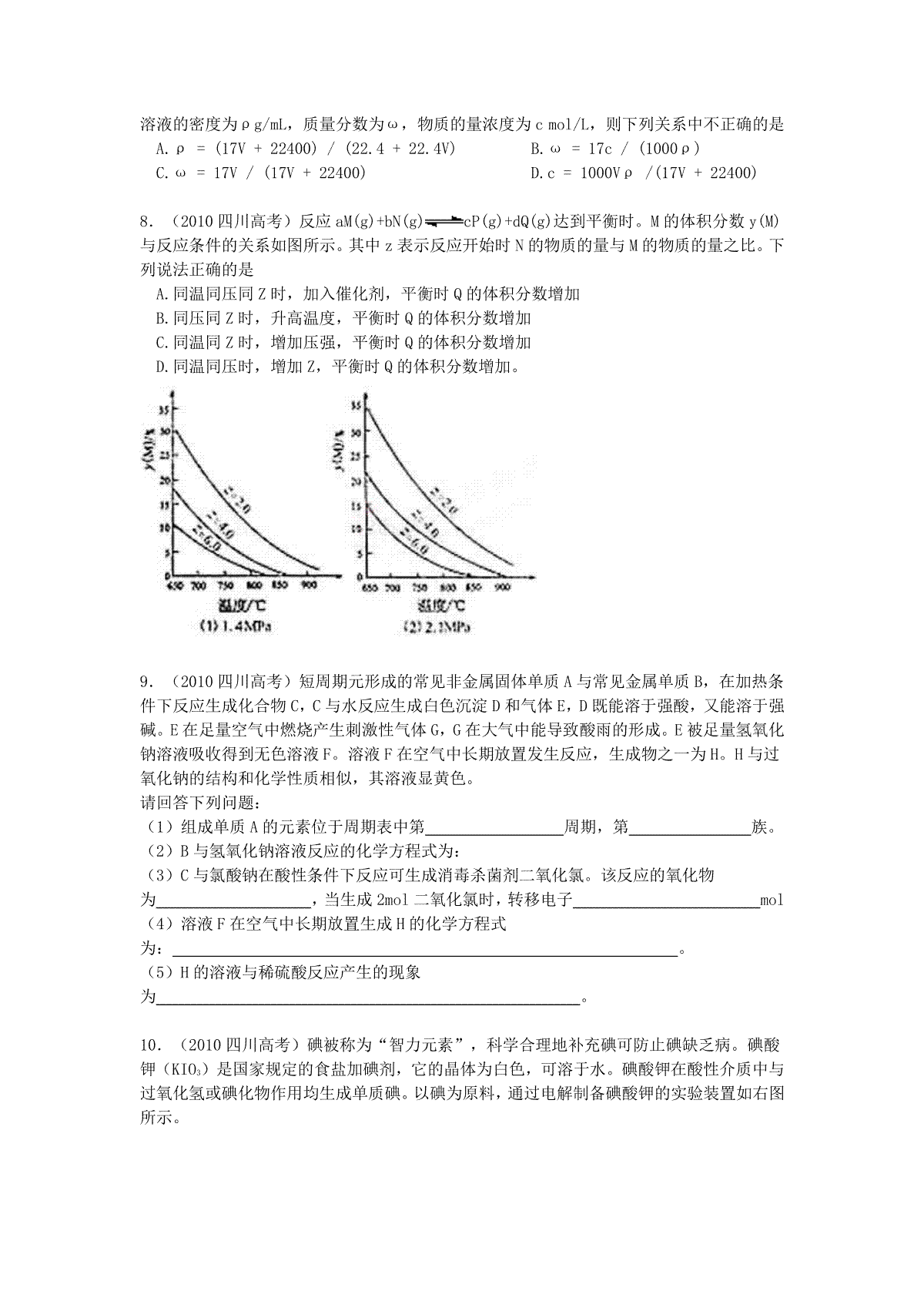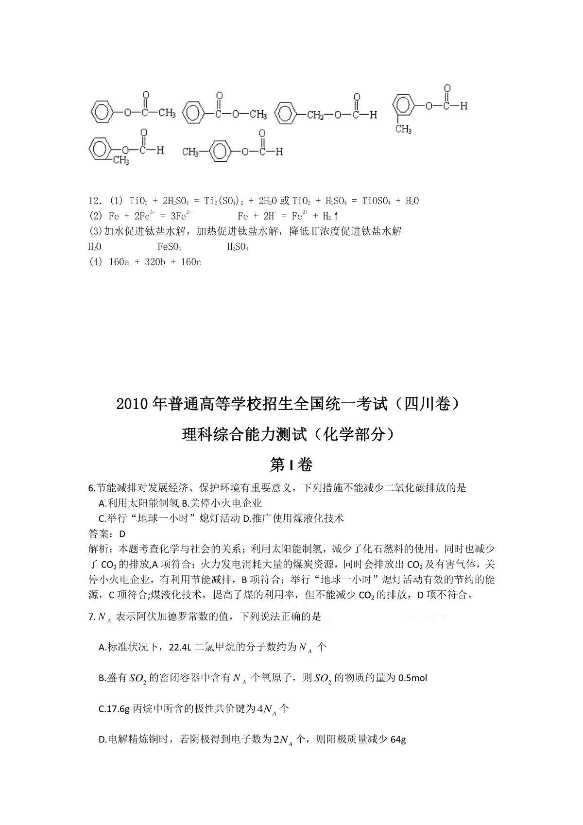 一、2010年高考四川理综化学试题和参考答案